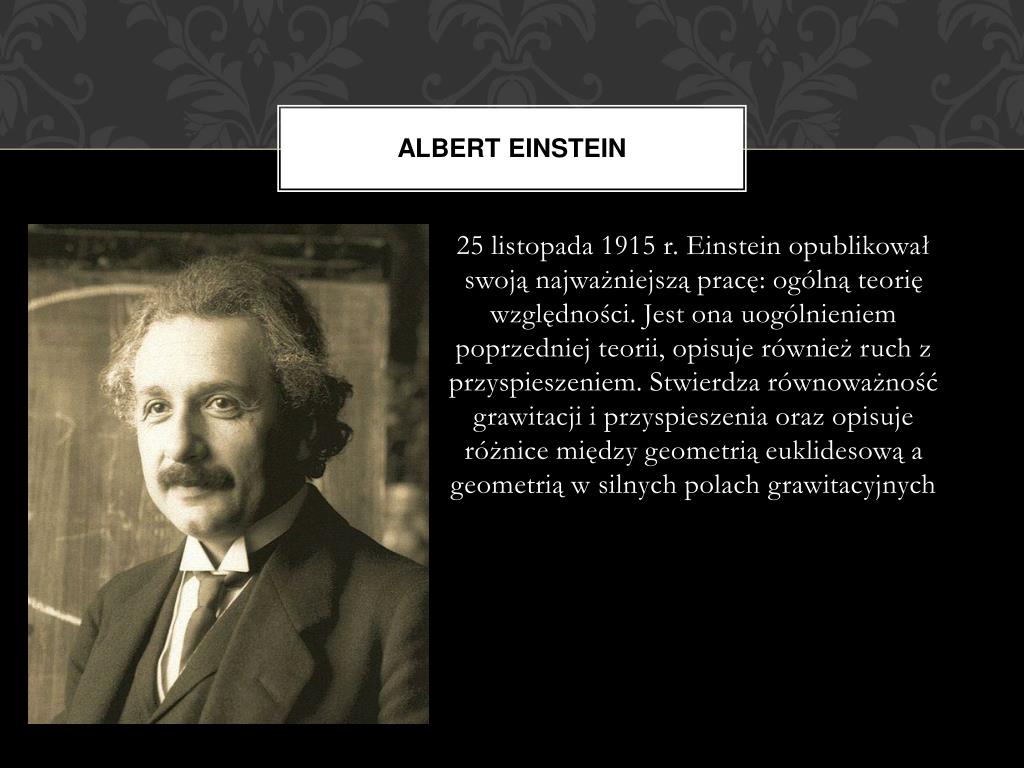 Albert Einstein • 25 listopada 1915 r. Einstein opublikował swoją najważniejszą pracę: ogólną teorię względności. Jest ona uogólnieniem poprzedniej teorii, opisuje również ruch z przyspieszeniem. Stwierdza równoważność grawitacji i przyspieszenia oraz opisuje różnice między geometrią euklidesową a geometrią w silnych polach grawitacyjnych