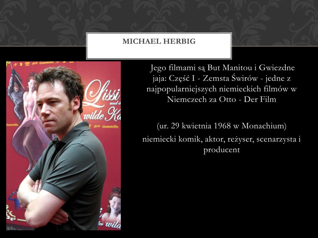 Michael Herbig • Jego filmami są But Manitou i Gwiezdne jaja: Część I - Zemsta Świrów - jedne z najpopularniejszych niemieckich filmów w Niemczech za Otto - Der Film • (ur. 29 kwietnia 1968 w Monachium) • niemiecki komik, aktor, reżyser, scenarzysta i producent