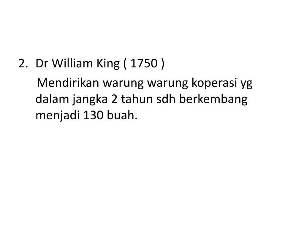 Dr William King ( 1750 ) Mendirikan warung warung koperasi yg dalam jangka 2 tahun sdh berkembang menjadi 130 buah.