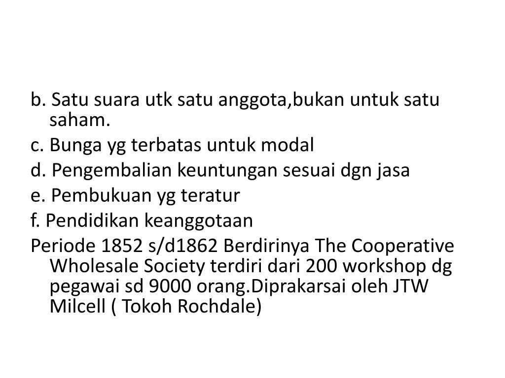 b. Satu suara utk satu anggota,bukan untuk satu saham. c. Bunga yg terbatas untuk modal d. Pengembalian keuntungan sesuai dgn jasa e. Pembukuan yg teratur f. Pendidikan keanggotaan Periode 1852 s/d1862 Berdirinya The Cooperative Wholesale Society terdiri dari 200 workshop dg pegawai sd 9000 orang.Diprakarsai oleh JTW Milcell ( Tokoh Rochdale)