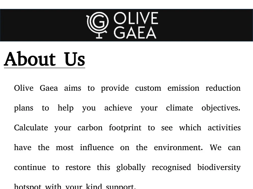 About Us Olive Gaea aims to provide custom emission reduction plans to help you achieve your climate objectives. Calculate your carbon footprint to see which activities have the most influence on the environment. We can continue to restore this globally recognised biodiversity hotspot with your kind support.