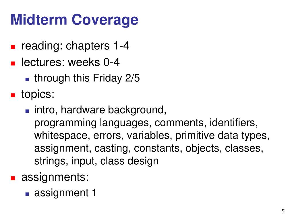 Midterm Coverage • reading: chapters 1-4 • lectures: weeks 0-4 • through this Friday 2/5 • topics: • intro, hardware background, programming languages, comments, identifiers, whitespace, errors, variables, primitive data types, assignment, casting, constants, objects, classes, strings, input, class design • assignments: • assignment 1