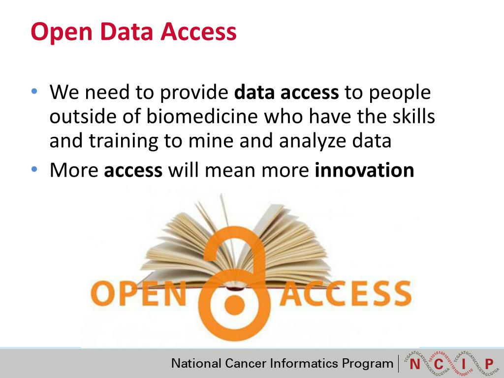 Open Data Access • We need to provide data access to people outside of biomedicine who have the skills and training to mine and analyze data • More access will mean more innovation