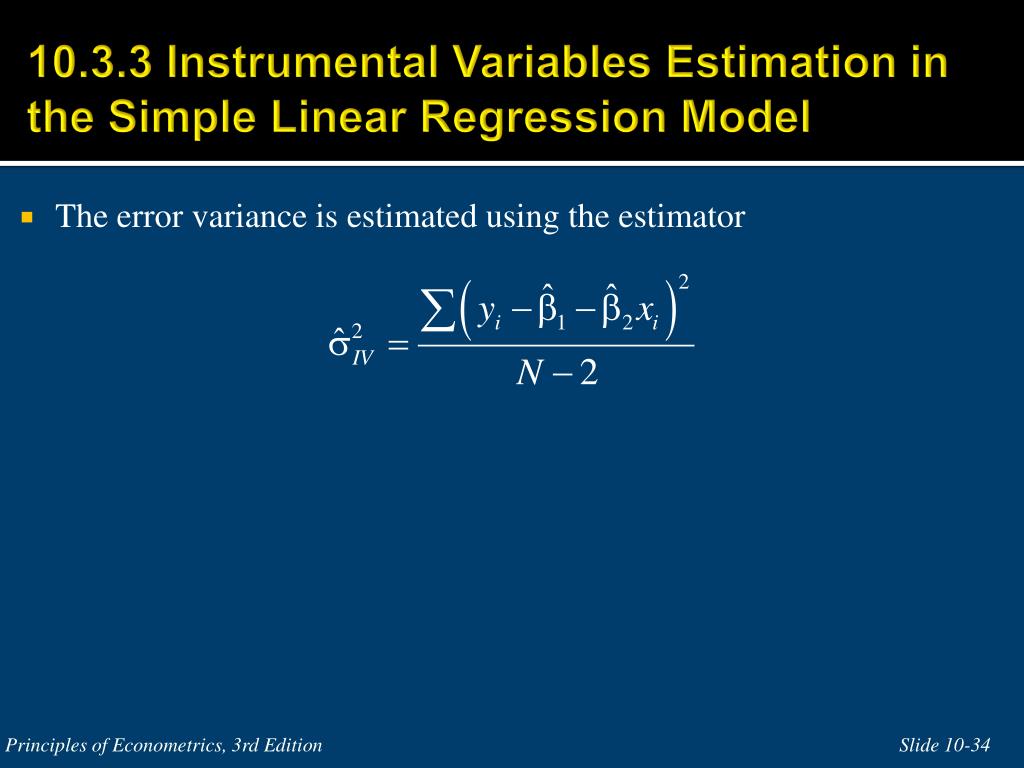 10.3.3 Instrumental Variables Estimation in the Simple Linear Regression Model • The error variance is estimated using the estimator Principles of Econometrics, 3rd Edition