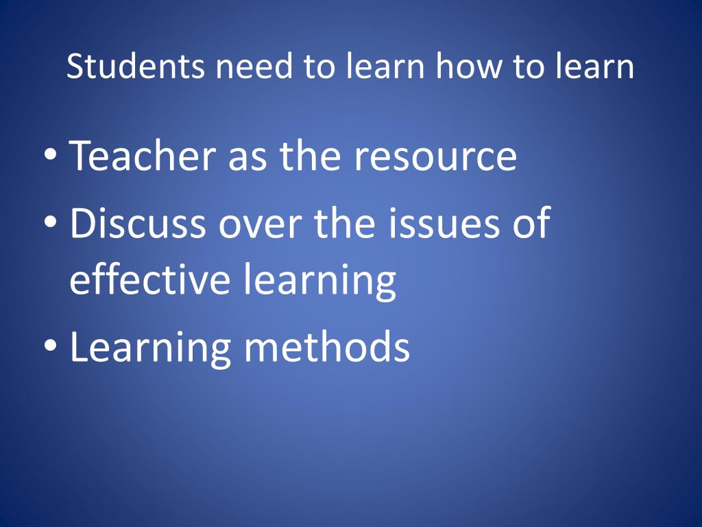 Students need to learn how to learn • Teacher as the resource • Discuss over the issues of effective learning • Learning methods