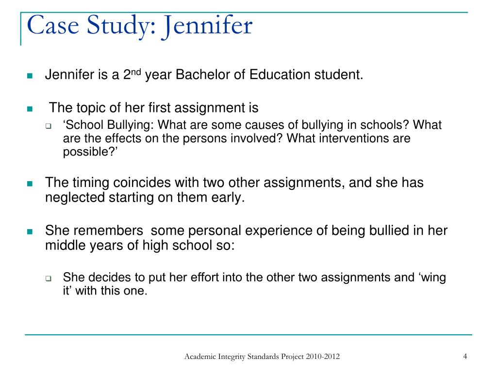 Case Study: Jennifer • Jennifer is a 2nd year Bachelor of Education student. • The topic of her first assignment is • ‘School Bullying: What are some causes of bullying in schools? What are the effects on the persons involved? What interventions are possible?’ • The timing coincides with two other assignments, and she has neglected starting on them early. • She remembers some personal experience of being bullied in her middle years of high school so: • She decides to put her effort into the other two assignments and ‘wing it’ with this one. Academic Integrity Standards Project 2010-2012