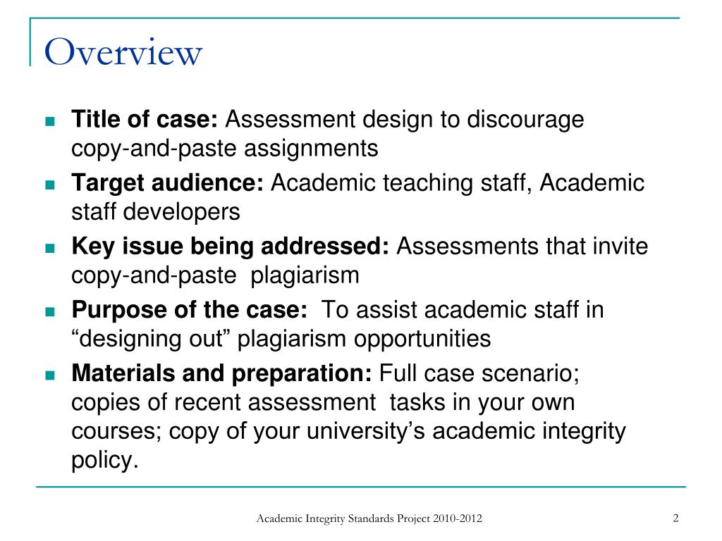 Overview • Title of case: Assessment design to discourage copy-and-paste assignments • Target audience: Academic teaching staff, Academic staff developers • Key issue being addressed: Assessments that invite copy-and-paste plagiarism • Purpose of the case:To assist academic staff in “designing out” plagiarism opportunities • Materials and preparation: Full case scenario; copies of recent assessment tasks in your own courses; copy of your university’s academic integrity policy. Academic Integrity Standards Project 2010-2012