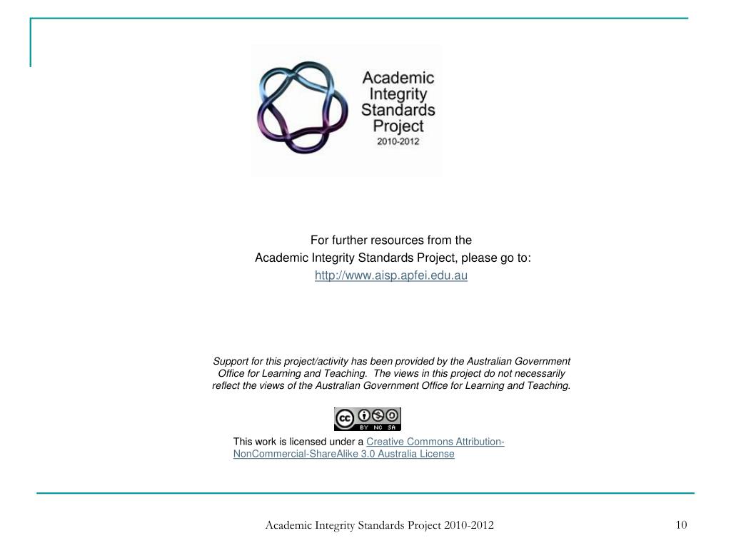 For further resources from the Academic Integrity Standards Project, please go to: http://www.aisp.apfei.edu.au Support for this project/activity has been provided by the Australian Government Office for Learning and Teaching. The views in this project do not necessarily reflect the views of the Australian Government Office for Learning and Teaching. This work is licensed under a Creative Commons Attribution-NonCommercial-ShareAlike 3.0 Australia License Academic Integrity Standards Project 2010-2012