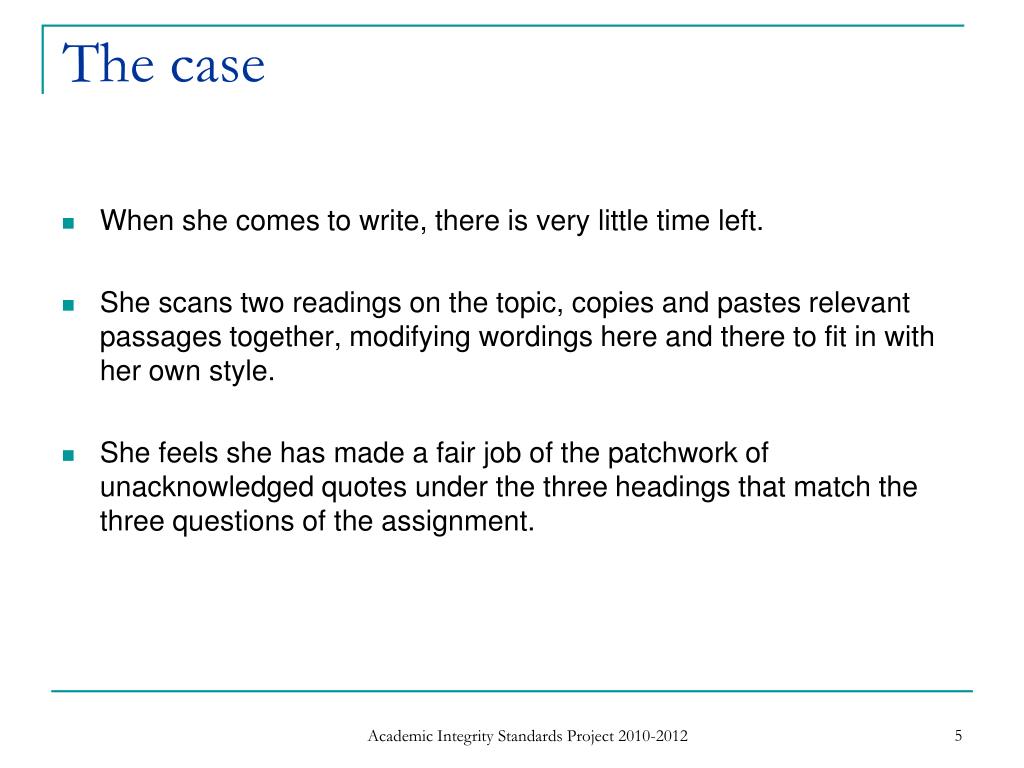 The case • When she comes to write, there is very little time left. • She scans two readings on the topic, copies and pastes relevant passages together, modifying wordings here and there to fit in with her own style. • She feels she has made a fair job of the patchwork of unacknowledged quotes under the three headings that match the three questions of the assignment. Academic Integrity Standards Project 2010-2012