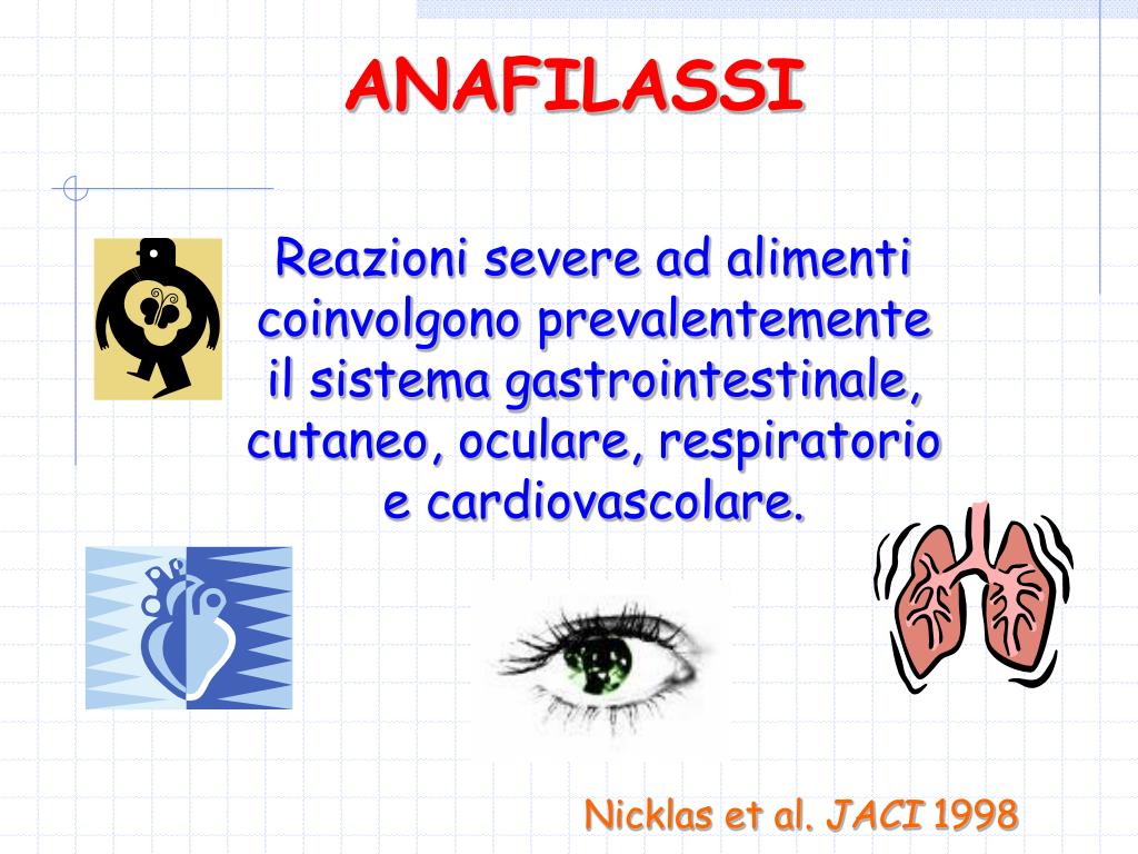 ANAFILASSI Reazioni severe ad alimenti coinvolgono prevalentemente il sistema gastrointestinale, cutaneo, oculare, respiratorio e cardiovascolare. Nicklas et al. JACI 1998
