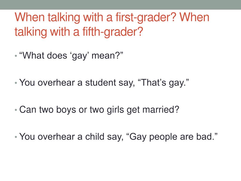 When talking with a first-grader? When talking with a fifth-grader? • “What does ‘gay’ mean?” • You overhear a student say, “That’s gay.” • Can two boys or two girls get married? • You overhear a child say, “Gay people are bad.”