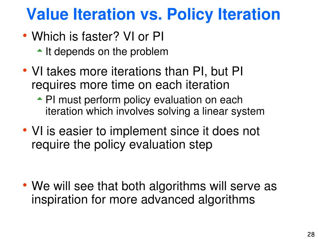 Value Iteration vs. Policy Iteration • Which is faster? VI or PI • It depends on the problem • VI takes more iterations than PI, but PI requires more time on each iteration • PI must perform policy evaluation on each iteration which involves solving a linear system • VI is easier to implement since it does not require the policy evaluation step • We will see that both algorithms will serve as inspiration for more advanced algorithms