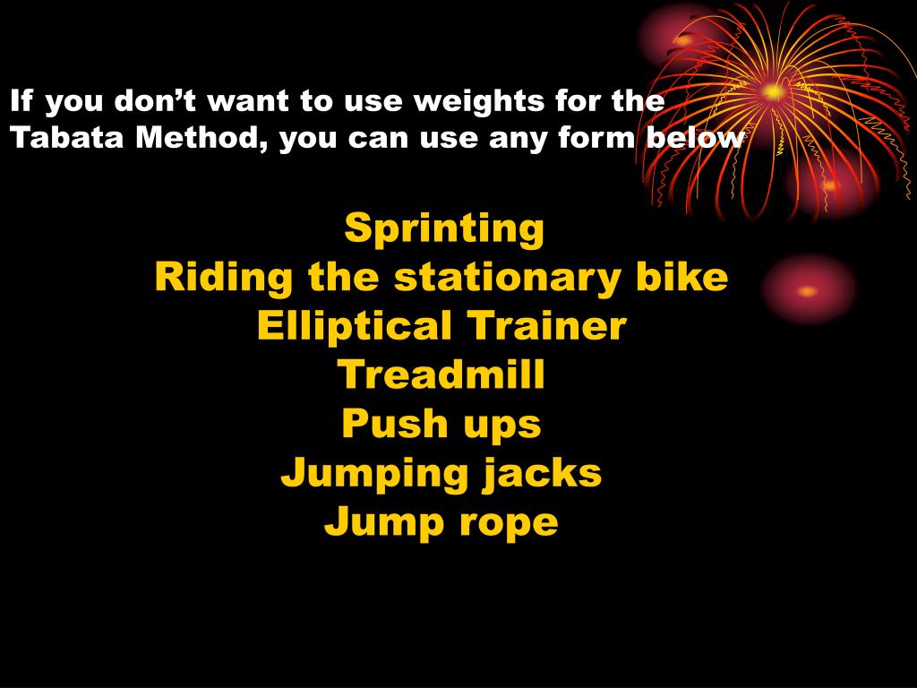 If you don’t want to use weights for the Tabata Method, you can use any form below SprintingRiding the stationary bikeElliptical TrainerTreadmillPush upsJumping jacksJump rope