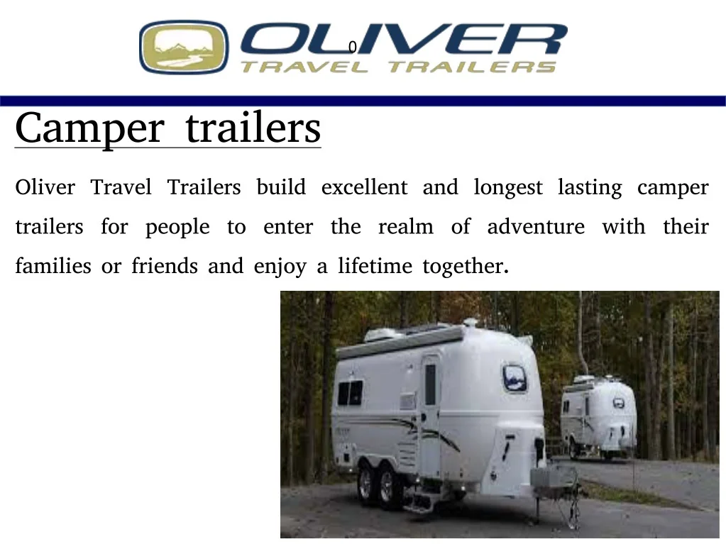 0 Camper trailers Oliver Travel Trailers build excellent and longest lasting camper trailers for people to enter the realm of adventure with their families or friends and enjoy a lifetime together.