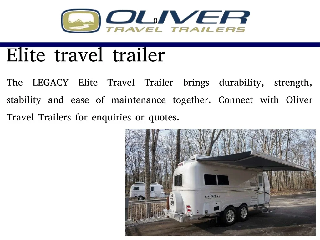 0 Elite travel trailer The LEGACY Elite Travel Trailer brings durability, strength, stability and ease of maintenance together. Connect with Oliver Travel Trailers for enquiries or quotes.