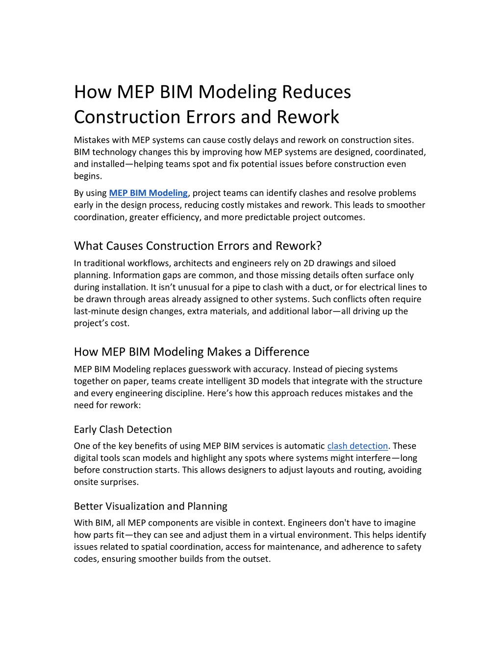 How MEP BIM Modeling Reduces Construction Errors and Rework Mistakes with MEP systems can cause costly delays and rework on construction sites. BIM technology changes this by improving how MEP systems are designed, coordinated, and installed—helping teams spot and fix potential issues before construction even begins. By using MEP BIM Modeling, project teams can identify clashes and resolve problems early in the design process, reducing costly mistakes and rework. This leads to smoother coordination, greater efficiency, and more predictable project outcomes. What Causes Construction Errors and Rework? In traditional workflows, architects and engineers rely on 2D drawings and siloed planning. Information gaps are common, and those missing details often surface only during installation. It isn’t unusual for a pipe to clash with a duct, or for electrical lines to be drawn through areas already assigned to other systems. Such conflicts often require last-minute design changes, extra materials, and additional labor—all driving up the project’s cost. How MEP BIM Modeling Makes a Difference MEP BIM Modeling replaces guesswork with accuracy. Instead of piecing systems together on paper, teams create intelligent 3D models that integrate with the structure and every engineering discipline. Here’s how this approach reduces mistakes and the need for rework: Early Clash Detection One of the key benefits of using MEP BIM services is automatic clash detection. These digital tools scan models and highlight any spots where systems might interfere—long before construction starts. This allows designers to adjust layouts and routing, avoiding onsite surprises. Better Visualization and Planning With BIM, all MEP components are visible in context. Engineers don't have to imagine how parts fit—they can see and adjust them in a virtual environment. This helps identify issues related to spatial coordination, access for maintenance, and adherence to safety codes, ensuring smoother builds from the outset.