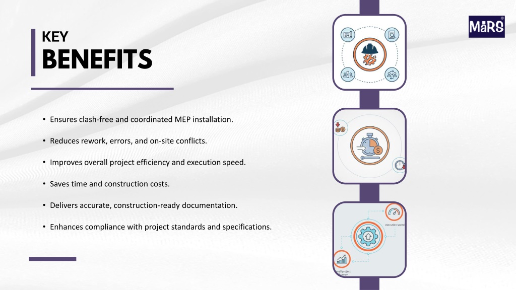 KEY BENEFITS • Ensures clash-free and coordinated MEP installation. • Reduces rework, errors, and on-site conflicts. • Improves overall project efficiency and execution speed. • Saves time and construction costs. • Delivers accurate, construction-ready documentation. • Enhances compliance with project standards and specifications.