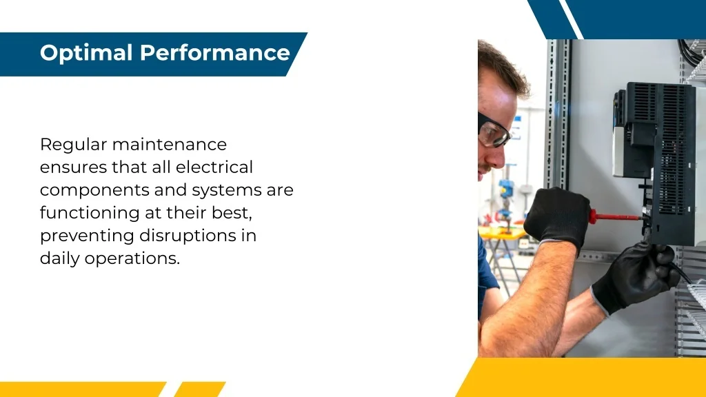 Optimal Performance Regular maintenance ensures that all electrical components and systems are functioning at their best, preventing disruptions in daily operations.