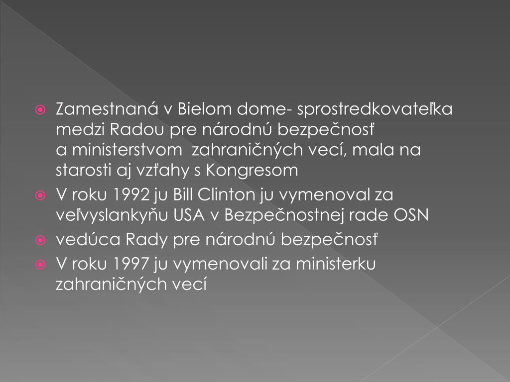 Zamestnaná v Bielom dome- sprostredkovateľka medzi Radou pre národnú bezpečnosť a ministerstvom zahraničných vecí, mala na starosti aj vzťahy s Kongresom • V roku 1992 ju BillClintonju vymenoval za veľvyslankyňu USA v Bezpečnostnej rade OSN • vedúca Rady pre národnú bezpečnosť • V roku 1997 ju vymenovali za ministerku zahraničných vecí