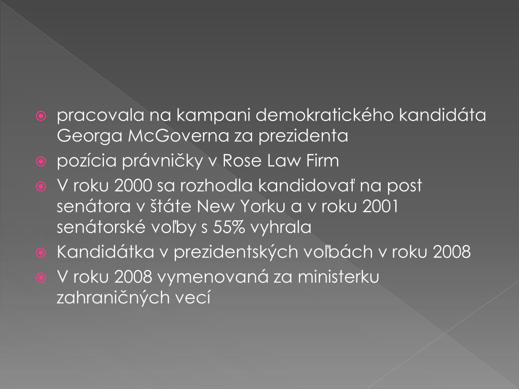 pracovala na kampani demokratického kandidáta GeorgaMcGoverna za prezidenta • pozícia právničky v Rose LawFirm • V roku 2000 sa rozhodla kandidovať na post senátora v štáte New Yorku a v roku 2001 senátorské voľby s 55% vyhrala • Kandidátka v prezidentských voľbách v roku 2008 • V roku 2008 vymenovaná za ministerku zahraničných vecí