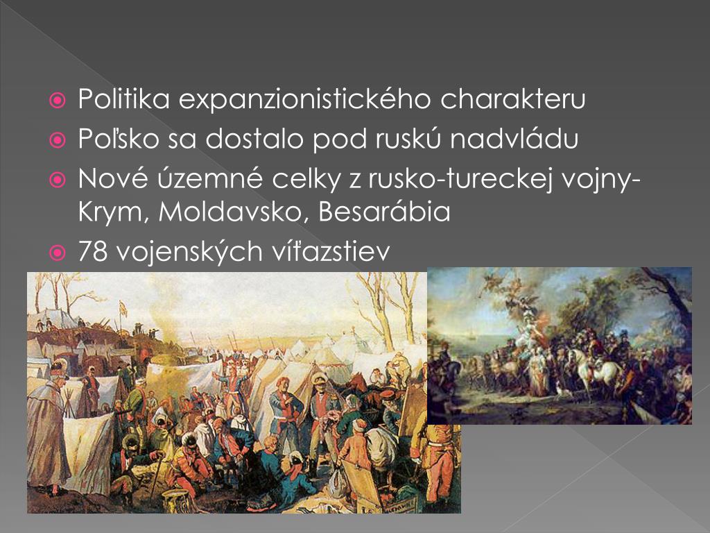 Politika expanzionistického charakteru • Poľsko sa dostalo pod ruskú nadvládu • Nové územné celky z rusko-tureckej vojny- Krym, Moldavsko, Besarábia • 78 vojenských víťazstiev