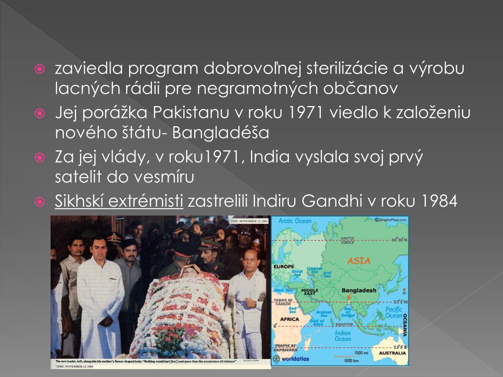 zaviedla program dobrovoľnej sterilizácie a výrobu lacných rádii pre negramotných občanov • Jej porážka Pakistanu v roku 1971 viedlo k založeniu nového štátu- Bangladéša • Za jej vlády, v roku1971, India vyslala svoj prvý satelit do vesmíru • Sikhskí extrémisti zastrelili IndiruGandhi v roku 1984