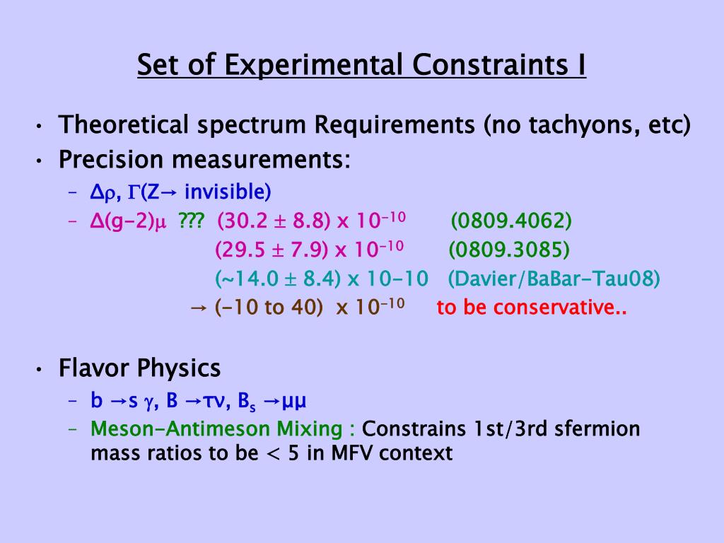 Set of Experimental Constraints I • Theoretical spectrum Requirements (no tachyons, etc) • Precision measurements: • Δ, (Z→ invisible) • Δ(g-2) ??? (30.2 8.8) x 10-10(0809.4062) (29.5 7.9) x 10-10(0809.3085) (~14.0 8.4) x 10-10 (Davier/BaBar-Tau08) → (-10 to 40) x 10-10 to be conservative.. • Flavor Physics • b →s , B →τν, Bs→μμ • Meson-Antimeson Mixing : Constrains 1st/3rd sfermion mass ratios to be < 5 in MFV context