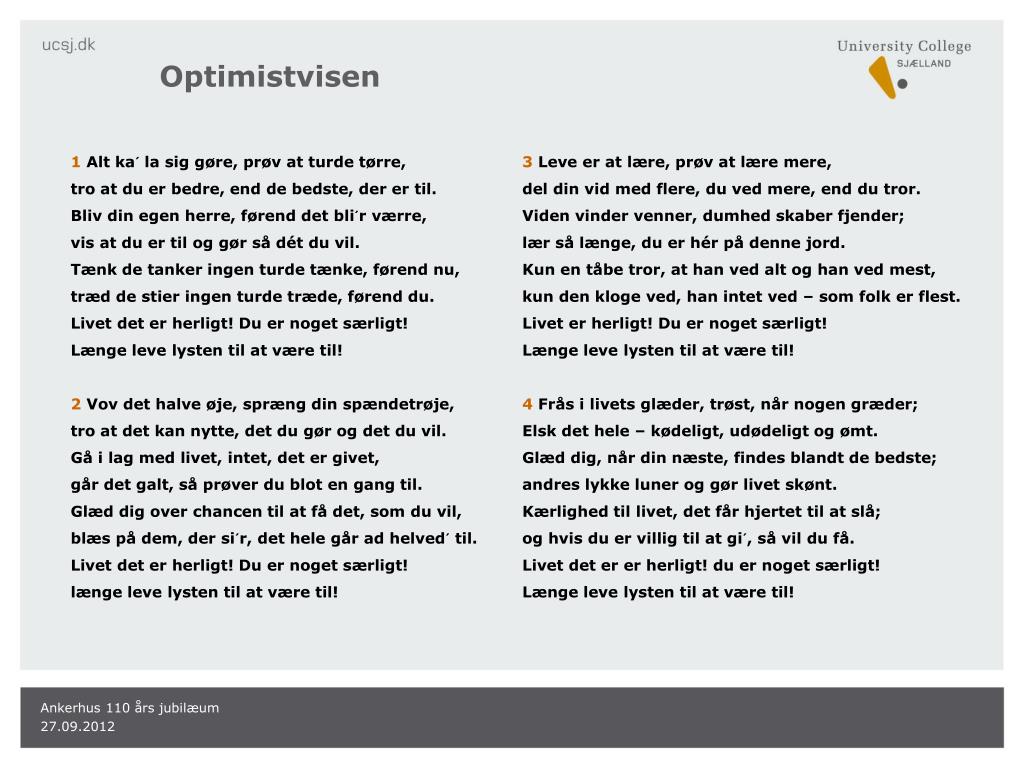 Optimistvisen 1 Alt ka´ la sig gøre, prøv at turde tørre, tro at du er bedre, end de bedste, der er til. Bliv din egen herre, førend det bli´r værre, vis at du er til og gør så dét du vil. Tænk de tanker ingen turde tænke, førend nu, træd de stier ingen turde træde, førend du. Livet det er herligt! Du er noget særligt! Længe leve lysten til at være til! 2 Vov det halve øje, spræng din spændetrøje, tro at det kan nytte, det du gør og det du vil. Gå i lag med livet, intet, det er givet, går det galt, så prøver du blot en gang til. Glæd dig over chancen til at få det, som du vil, blæs på dem, der si´r, det hele går ad helved´ til. Livet det er herligt! Du er noget særligt! længe leve lysten til at være til! 3 Leve er at lære, prøv at lære mere, del din vid med flere, du ved mere, end du tror. Viden vinder venner, dumhed skaber fjender; lær så længe, du er hér på denne jord. Kun en tåbe tror, at han ved alt og han ved mest, kun den kloge ved, han intet ved – som folk er flest. Livet er herligt! Du er noget særligt! Længe leve lysten til at være til! 4 Frås i livets glæder, trøst, når nogen græder; Elsk det hele – kødeligt, udødeligt og ømt. Glæd dig, når din næste, findes blandt de bedste; andres lykke luner og gør livet skønt. Kærlighed til livet, det får hjertet til at slå; og hvis du er villig til at gi´, så vil du få. Livet det er er herligt! du er noget særligt! Længe leve lysten til at være til!