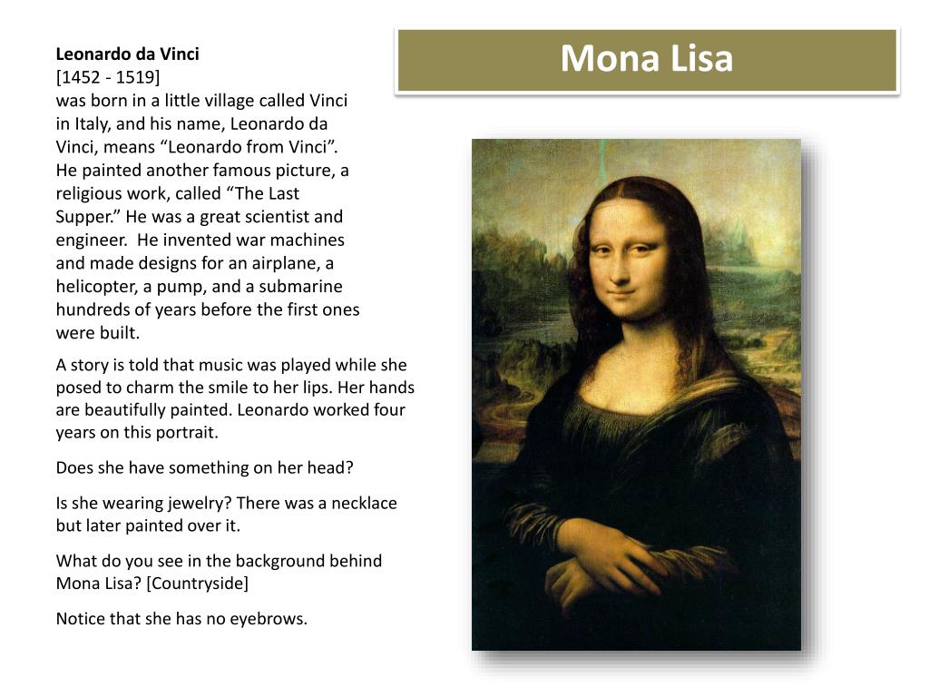 Leonardo da Vinci[1452 - 1519]was born in a little village called Vinci in Italy, and his name, Leonardo da Vinci, means “Leonardo from Vinci”. He painted another famous picture, a religious work, called “The Last Supper.” He was a great scientist and engineer. He invented war machines and made designs for an airplane, a helicopter, a pump, and a submarine hundreds of years before the first ones were built. Mona Lisa A story is told that music was played while she posed to charm the smile to her lips. Her hands are beautifully painted. Leonardo worked four years on this portrait. Does she have something on her head? Is she wearing jewelry? There was a necklace but later painted over it. What do you see in the background behind Mona Lisa? [Countryside] Notice that she has no eyebrows.