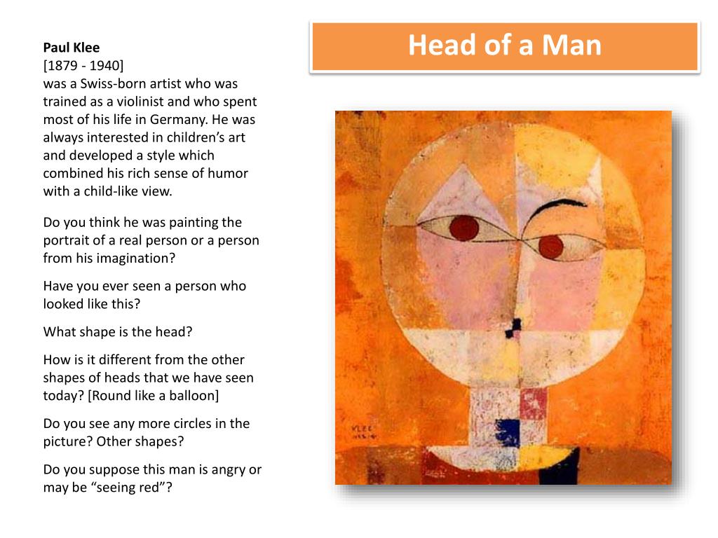 Paul Klee[1879 - 1940]was a Swiss-born artist who was trained as a violinist and who spent most of his life in Germany. He was always interested in children’s art and developed a style which combined his rich sense of humor with a child-like view. Head of a Man Do you think he was painting the portrait of a real person or a person from his imagination? Have you ever seen a person who looked like this? What shape is the head? How is it different from the other shapes of heads that we have seen today? [Round like a balloon] Do you see any more circles in the picture? Other shapes? Do you suppose this man is angry or may be “seeing red”?