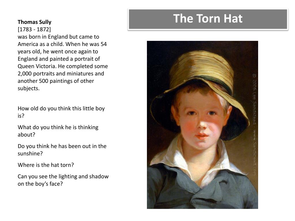 Thomas Sully[1783 - 1872]was born in England but came to America as a child. When he was 54 years old, he went once again to England and painted a portrait of Queen Victoria. He completed some 2,000 portraits and miniatures and another 500 paintings of other subjects. The Torn Hat How old do you think this little boy is? What do you think he is thinking about? Do you think he has been out in the sunshine? Where is the hat torn? Can you see the lighting and shadow on the boy’s face?