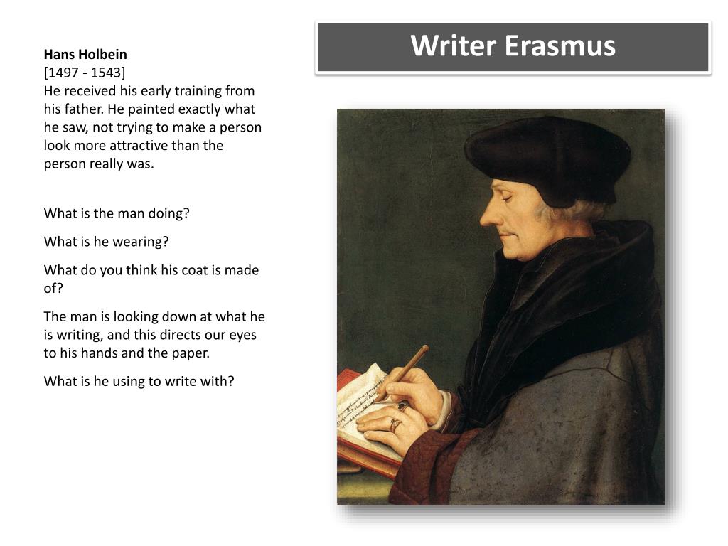 Hans Holbein[1497 - 1543]He received his early training from his father. He painted exactly what he saw, not trying to make a person look more attractive than the person really was. Writer Erasmus What is the man doing? What is he wearing? What do you think his coat is made of? The man is looking down at what he is writing, and this directs our eyes to his hands and the paper. What is he using to write with?