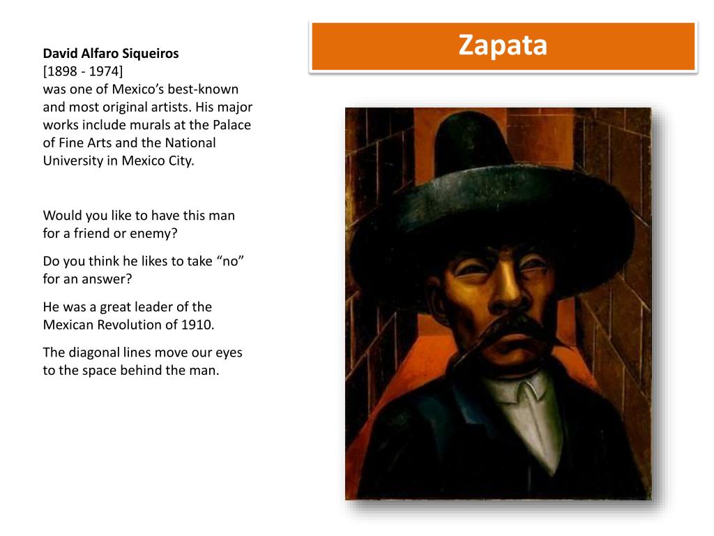 David Alfaro Siqueiros[1898 - 1974]was one of Mexico’s best-known and most original artists. His major works include murals at the Palace of Fine Arts and the National University in Mexico City. Zapata Would you like to have this man for a friend or enemy? Do you think he likes to take “no” for an answer? He was a great leader of the Mexican Revolution of 1910. The diagonal lines move our eyes to the space behind the man.