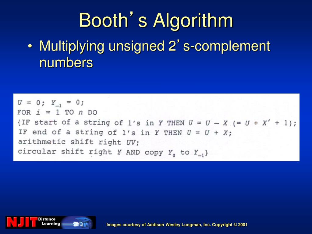 Booth’s Algorithm • Multiplying unsigned 2’s-complement numbers