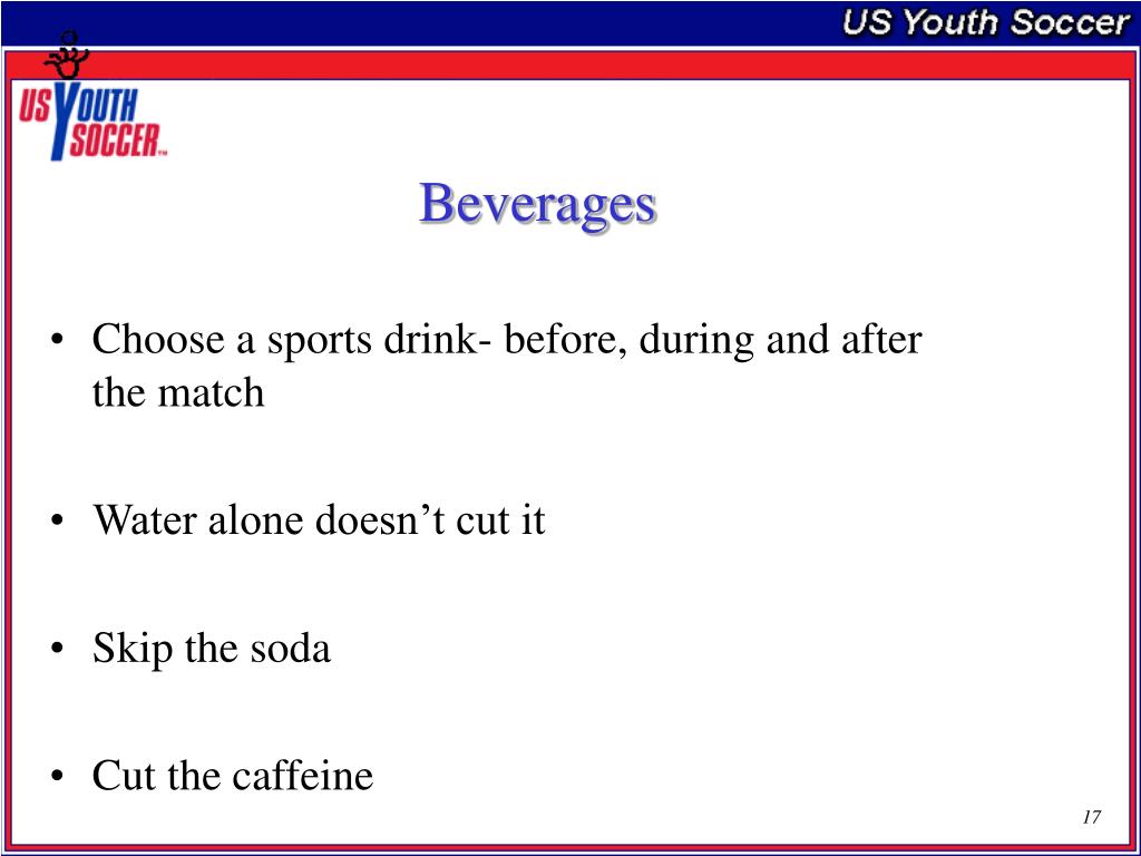 Beverages • Choose a sports drink- before, during and after the match • Water alone doesn’t cut it • Skip the soda • Cut the caffeine