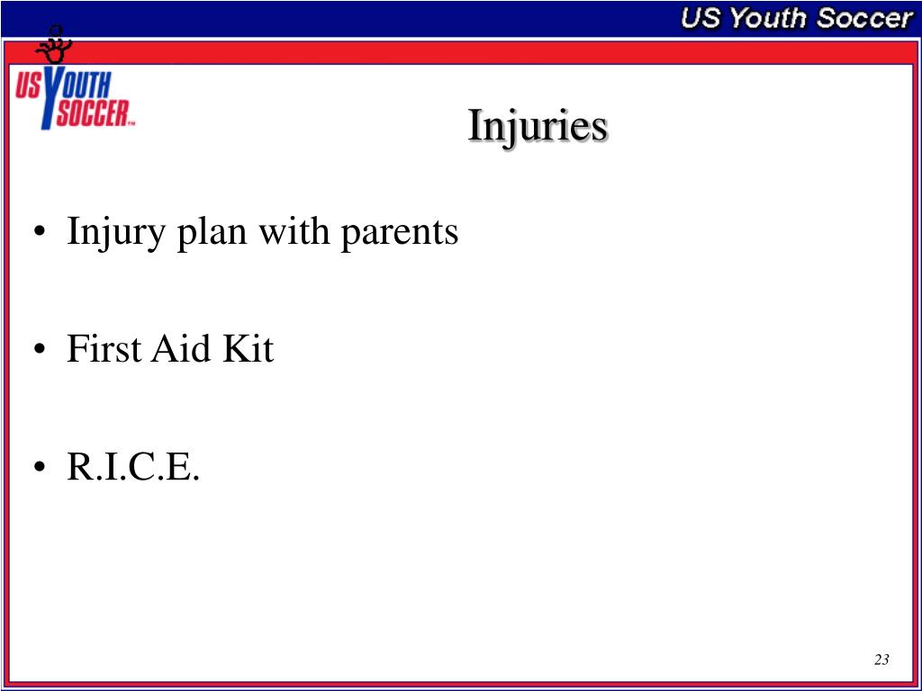 Injuries • Injury plan with parents • First Aid Kit • R.I.C.E.