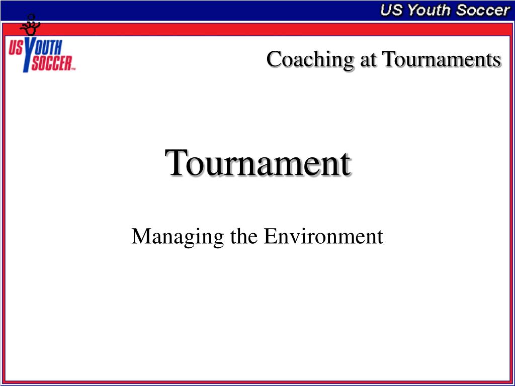 Coaching at Tournaments. US Youth Soccer Coaches Workshop Boston 2004. Don Gemmell Director of Coaching Education Michigan State Youth Soccer Association. Coaching at Tournaments. Success in tournament play can depend on your preparation before the first ball is ever kicked off!