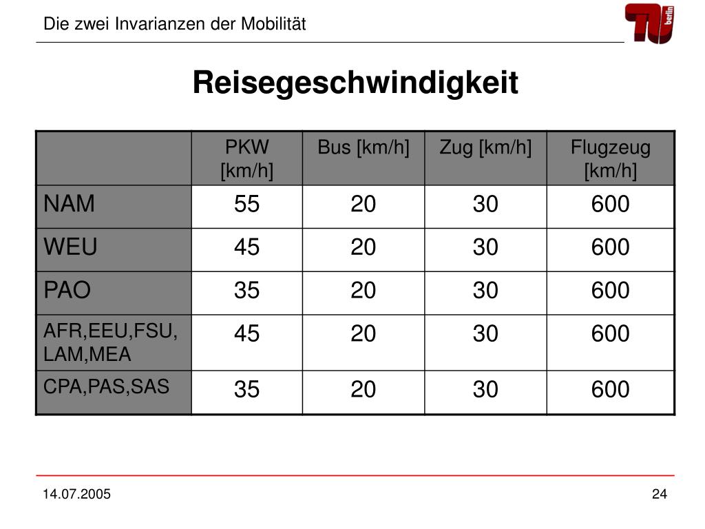 Zwei Invarianzen • Zeitaufwand für Mobilität (TTB) • 1,1 h pro Tag • Geldbudget für Mobilität (TMB) • 10-15% des Einkommens • Entwickelt von Zahavi (1980) • Aufgenommen von Schafer, Victor (2000) • Aufkommen der Mobilität bis 2050 • Aufteilung der Transportmittel bis 2050