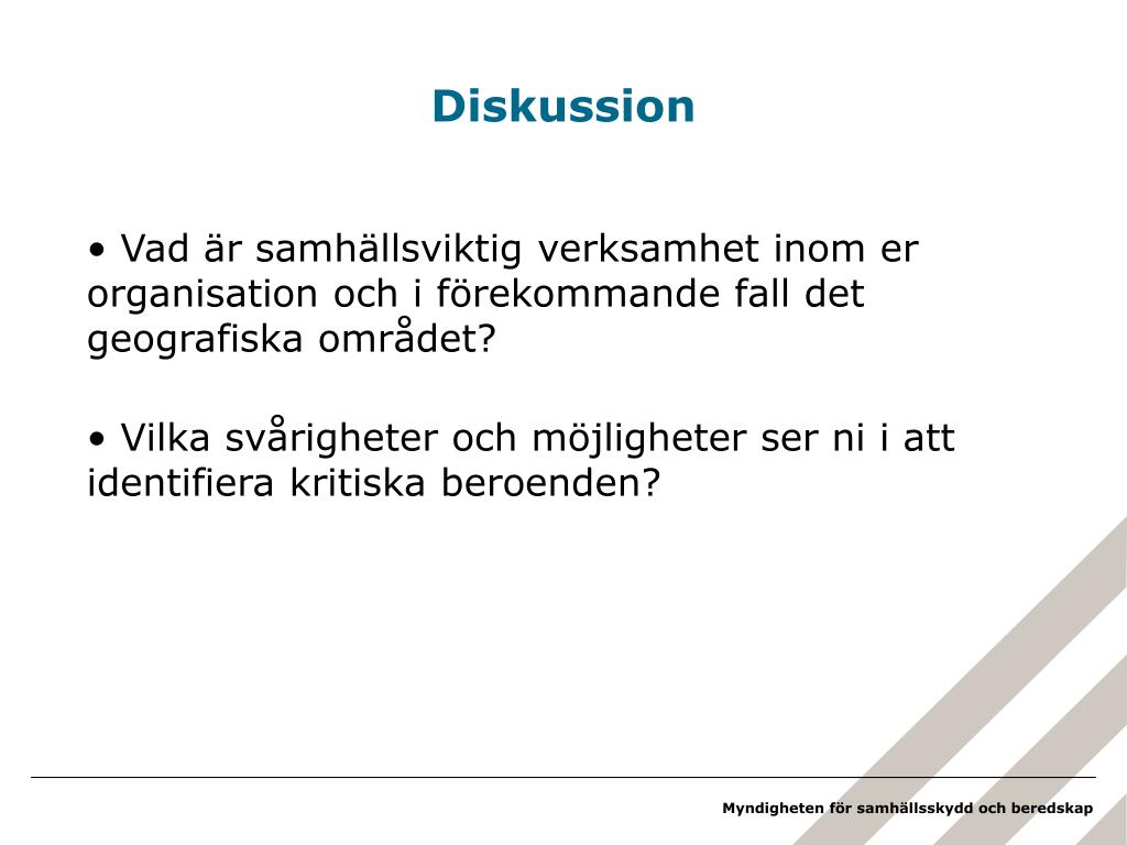 Diskussion • Vad är samhällsviktig verksamhet inom er organisation och i förekommande fall det geografiska området? • Vilka svårigheter och möjligheter ser ni i att identifiera kritiska beroenden?