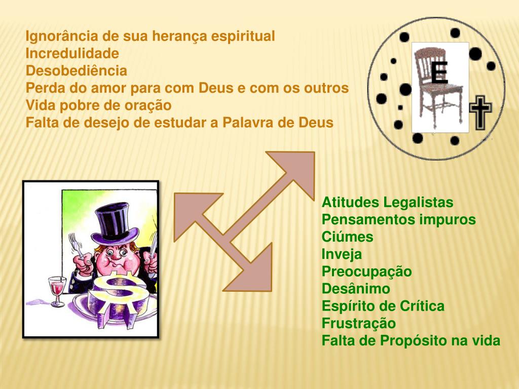 Ignorância de sua herança espiritualIncredulidadeDesobediênciaPerda do amor para com Deus e com os outrosVida pobre de oraçãoFalta de desejo de estudar a Palavra de Deus Atitudes LegalistasPensamentos impurosCiúmesInvejaPreocupaçãoDesânimoEspírito de CríticaFrustraçãoFalta de Propósito na vida