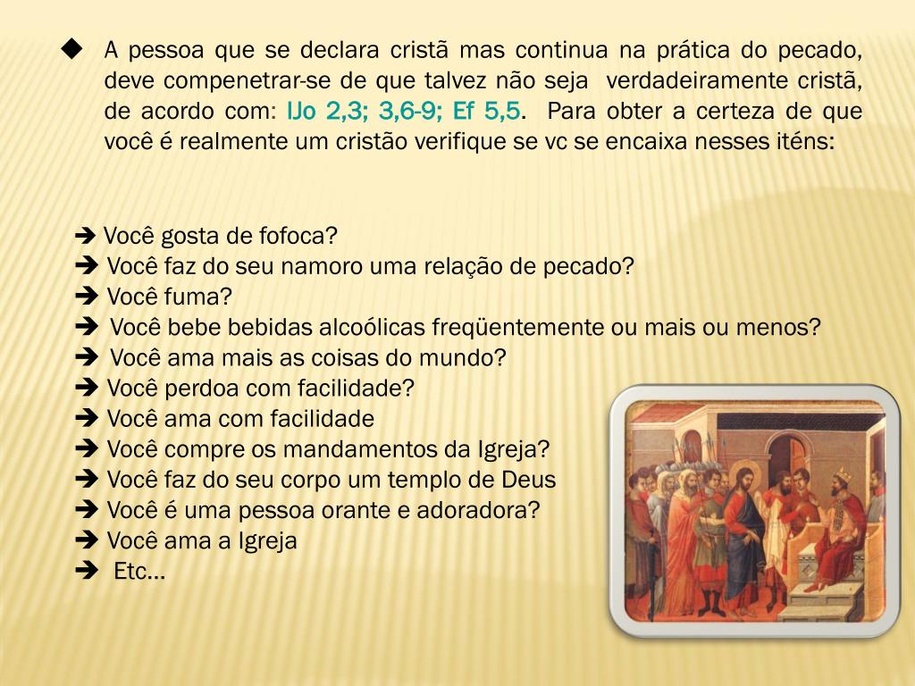 A pessoa que se declara cristã mas continua na prática do pecado, deve compenetrar-se de que talvez não seja verdadeiramente cristã, de acordo com: IJo 2,3; 3,6-9; Ef 5,5. Para obter a certeza de que você é realmente um cristão verifique se vc se encaixa nesses iténs: • Você gosta de fofoca? • Você faz do seu namoro uma relação de pecado? • Você fuma? • Você bebe bebidas alcoólicas freqüentemente ou mais ou menos? • Você ama mais as coisas do mundo? • Você perdoa com facilidade? • Você ama com facilidade • Você compre os mandamentos da Igreja? • Você faz do seu corpo um templo de Deus • Você é uma pessoa orante e adoradora? • Você ama a Igreja • Etc...