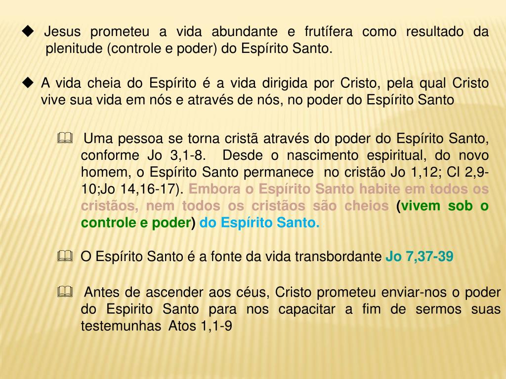 Jesus prometeu a vida abundante e frutífera como resultado da plenitude (controle e poder) do Espírito Santo. • A vida cheia do Espírito é a vida dirigida por Cristo, pela qual Cristo vive sua vida em nós e através de nós, no poder do Espírito Santo Uma pessoa se torna cristã através do poder do Espírito Santo, conforme Jo 3,1-8. Desde o nascimentoespiritual, do novo homem, o Espírito Santo permanece no cristão Jo 1,12; Cl 2,9-10;Jo 14,16-17).Embora o Espírito Santo habite em todos os cristãos, nem todos os cristãos são cheios (vivem sob o controle e poder) do Espírito Santo. O Espírito Santo é a fonte da vida transbordanteJo 7,37-39 Antes de ascender aos céus, Cristo prometeu enviar-nos o poder do Espirito Santo para nos capacitar a fim de sermos suas testemunhas Atos 1,1-9