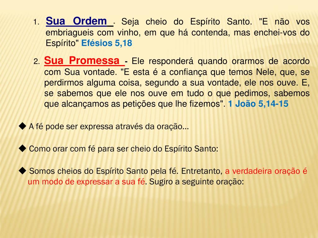 1.Sua Ordem-Seja cheio do Espírito Santo. "E não vos embriagueis com vinho, em que há contenda, mas enchei-vos do Espírito" Efésios 5,18 2.Sua Promessa -Ele responderá quando orarmos de acordo com Sua vontade. "E esta é a confiança que temos Nele, que, se perdirmos alguma coisa, segundo a sua vontade, ele nos ouve. E, se sabemos que ele nos ouve em tudo o que pedimos, sabemos que alcançamos as petições que lhe fizemos". 1 João 5,14-15 A fé pode ser expressa através da oração… Como orar com fé para ser cheio do Espírito Santo: Somos cheios do Espírito Santo pela fé. Entretanto, a verdadeira oração é um modo de expressar a sua fé. Sugiro a seguinte oração: