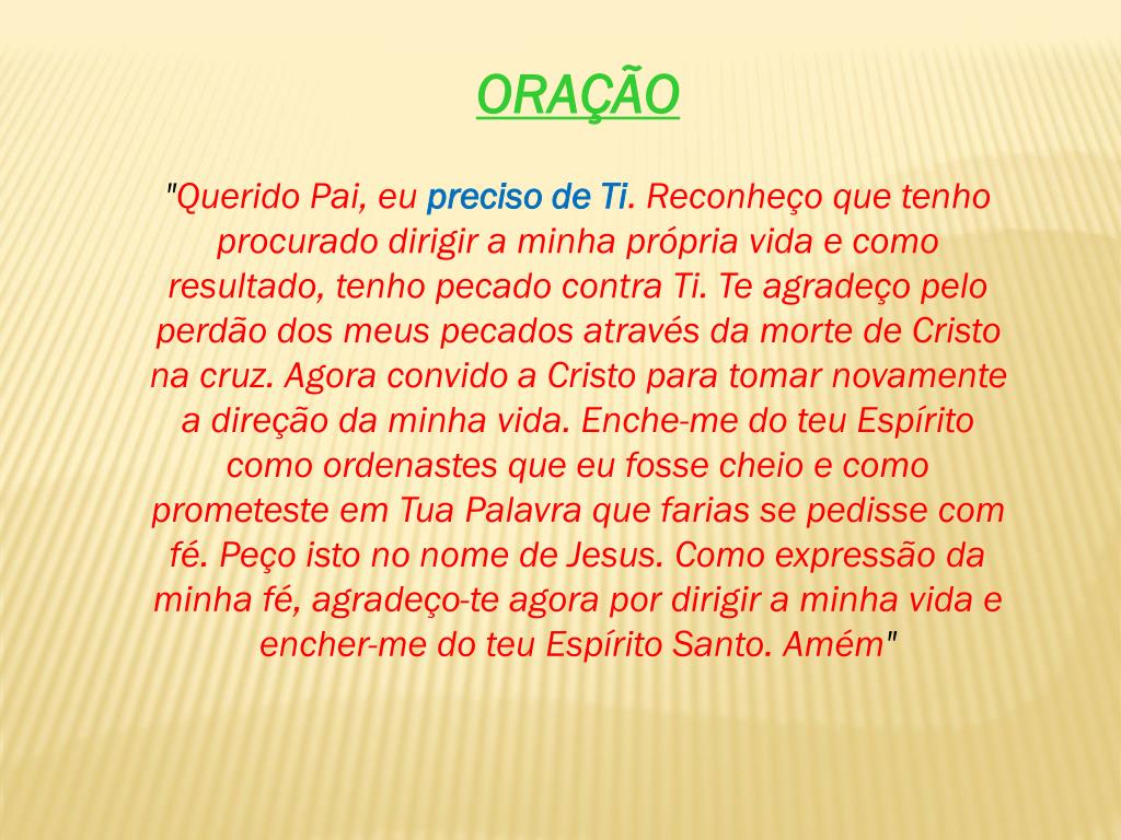 ORAÇÃO "Querido Pai, eu preciso de Ti. Reconheço que tenho procurado dirigir a minha própria vida e como resultado, tenho pecado contra Ti. Te agradeço pelo perdão dos meus pecados através da morte de Cristo na cruz. Agora convido a Cristo para tomar novamente a direção da minha vida. Enche-me do teu Espírito como ordenastes que eu fosse cheio e como prometeste em Tua Palavra que farias se pedisse com fé. Peço isto no nome de Jesus. Como expressão da minha fé, agradeço-te agora por dirigir a minha vida e encher-me do teu Espírito Santo. Amém"