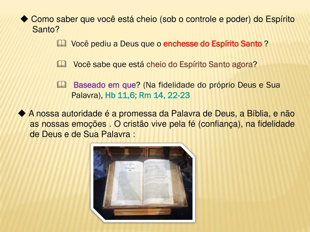 Como saber que você está cheio (sob o controle e poder) do Espírito Santo? • Você pediu a Deus que o enchesse do Espírito Santo ? • Você sabe que está cheio do Espírito Santo agora? • Baseado em que? (Na fidelidade do próprio Deus e Sua Palavra), Hb 11,6; Rm 14, 22-23 A nossa autoridade é a promessa da Palavra de Deus, a Bíblia, e não as nossas emoções . O cristão vive pela fé (confiança), na fidelidade de Deus e de Sua Palavra :