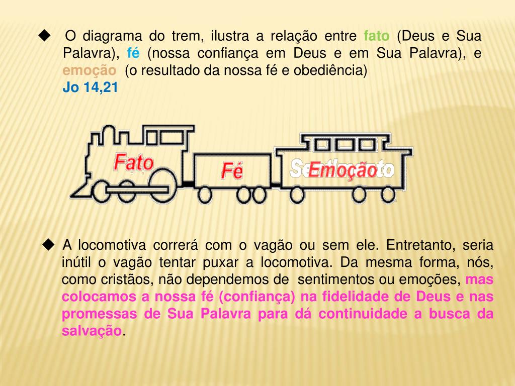 O diagrama do trem, ilustra a relação entre fato (Deus e Sua Palavra), fé (nossa confiança em Deus e em Sua Palavra), e emoção (o resultado da nossa fé e obediência) Jo 14,21 A locomotiva correrá com o vagão ou sem ele. Entretanto, seria inútil o vagão tentar puxar a locomotiva. Da mesma forma, nós, como cristãos, não dependemos de sentimentos ou emoções, mas colocamos a nossa fé (confiança) na fidelidade de Deus e nas promessas de Sua Palavra para dá continuidade a busca da salvação.