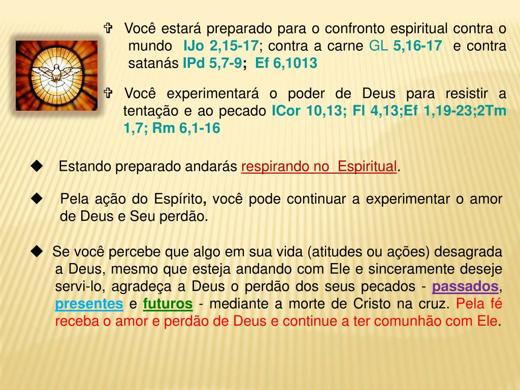 Você estará preparado para o confronto espiritual contra o mundo IJo 2,15-17; contra a carne GL 5,16-17 e contra satanás IPd 5,7-9; Ef 6,1013 Você experimentará o poder de Deus para resistir a tentação e ao pecado ICor 10,13; Fl 4,13;Ef 1,19-23;2Tm 1,7; Rm 6,1-16 Estando preparado andarás respirando no Espiritual. • Pela ação do Espírito, você pode continuar a experimentar o amor de Deus e Seu perdão. Se você percebe que algo em sua vida (atitudes ou ações) desagrada a Deus, mesmo que esteja andando com Ele e sinceramente deseje servi-lo, agradeça a Deus o perdão dos seus pecados - passados, presentes e futuros - mediante a morte de Cristo na cruz. Pela fé receba o amor e perdão de Deus e continue a ter comunhão com Ele.