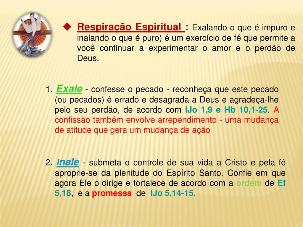 Respiração Espiritual : Exalando o que é impuro e inalando o que é puro) é um exercício de fé que permite a você continuar a experimentar o amor e o perdão de Deus. 1. Exale - confesse o pecado - reconheça que este pecado (ou pecados) é errado e desagrada a Deus e agradeça-lhe pelo seu perdão, de acordo com IJo 1,9 e Hb 10,1-25. A confissão também envolve arrependimento - uma mudança de atitude que gera um mudança de ação 2.Inale - submeta o controle de sua vida a Cristo e pela fé aproprie-se da plenitude do Espírito Santo. Confie em que agora Ele o dirige e fortalece de acordo com a ordem de Ef 5,18, e a promessa de IJo 5,14-15.