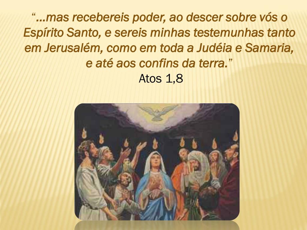 “...mas recebereis poder, ao descer sobre vós o Espírito Santo, e sereis minhas testemunhas tanto em Jerusalém, como em toda a Judéia e Samaria, e até aos confins da terra.” Atos 1,8