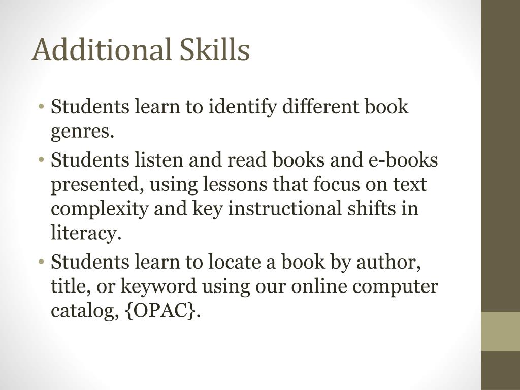 Additional Skills • Students learn to identify different book genres. • Students listen and read books and e-books presented, using lessons that focus on text complexity and key instructional shifts in literacy. • Students learn to locate a book by author, title, or keyword using our online computer catalog, {OPAC}.